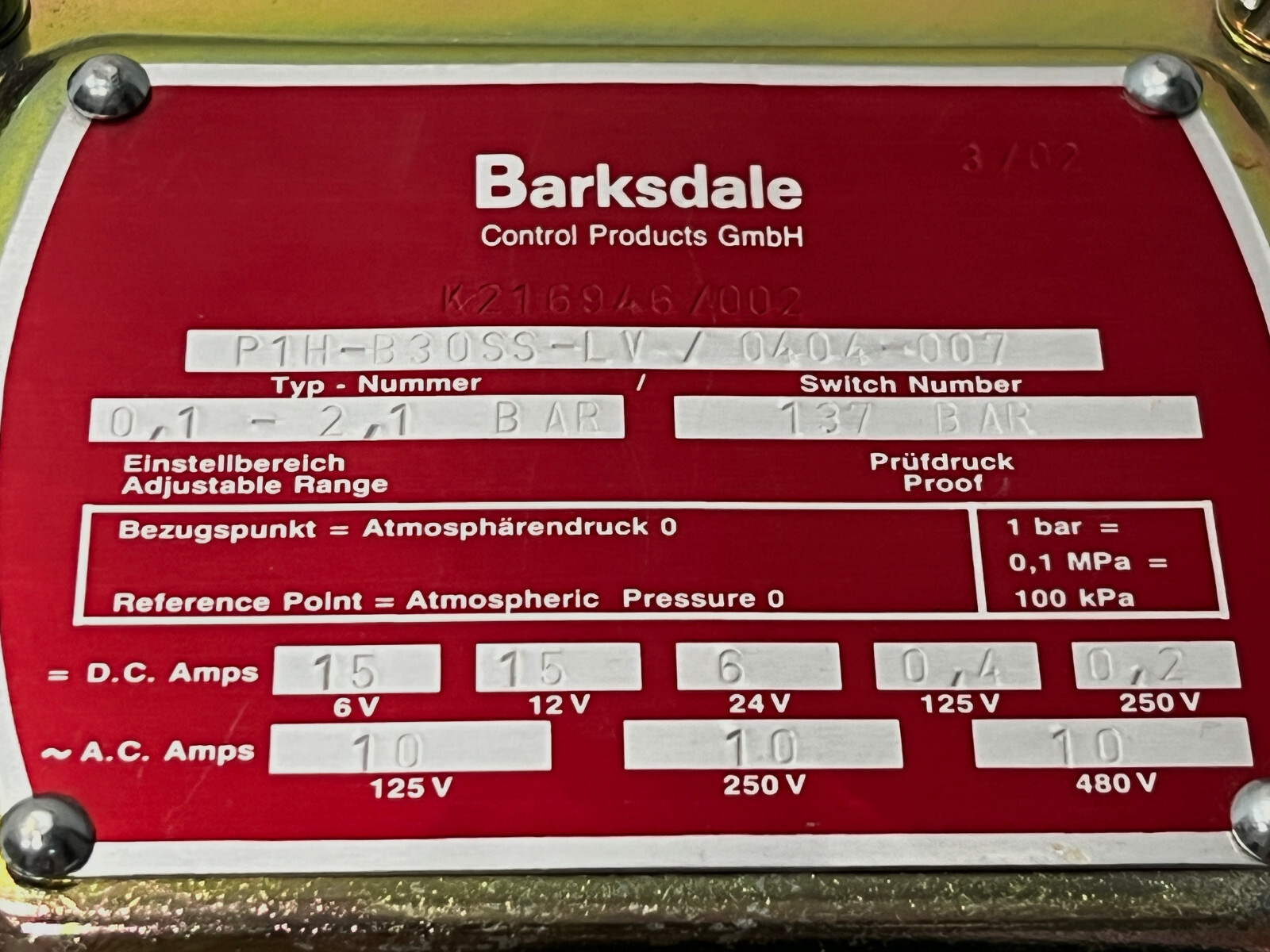 Barksdale P1H-B30SS-LV/0404-007 Pressure Switch 0.1 – 2.1 Bar