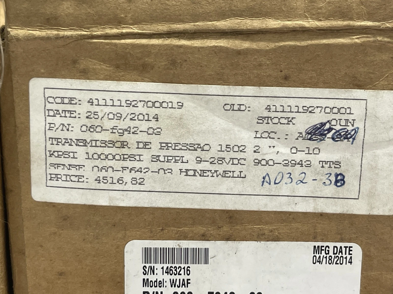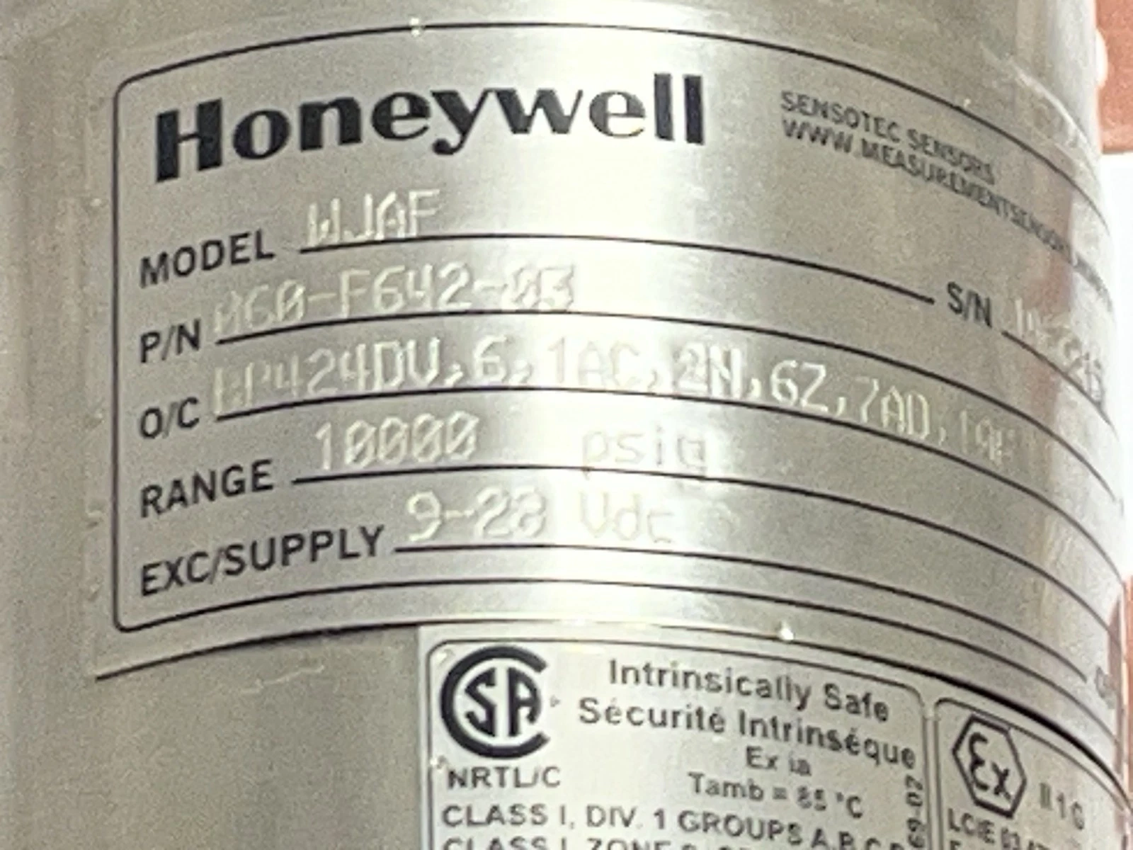 Honeywell Sensotec WJAF 060-F642-03 Transmitter Sensor Range 10000 PSIG