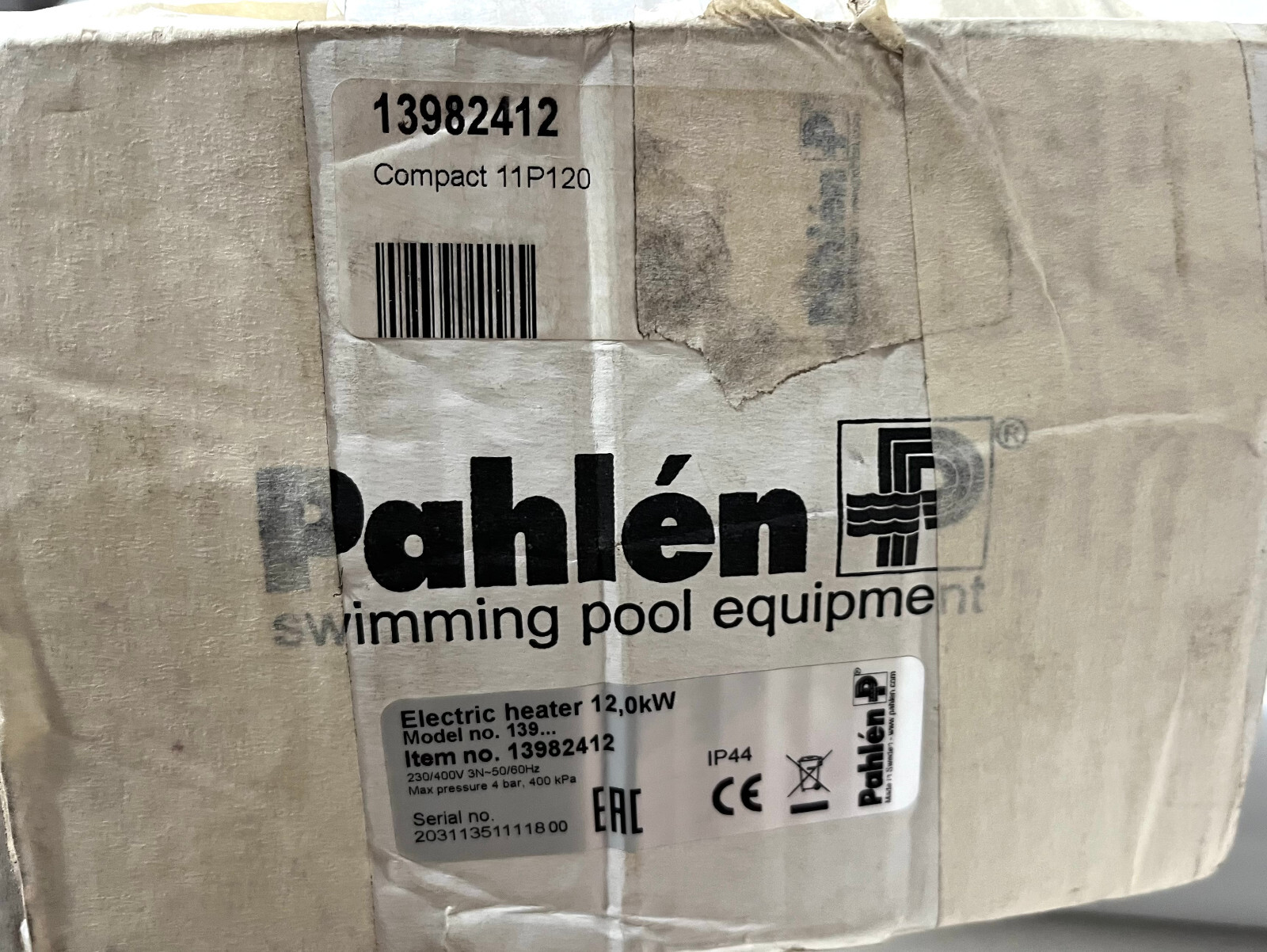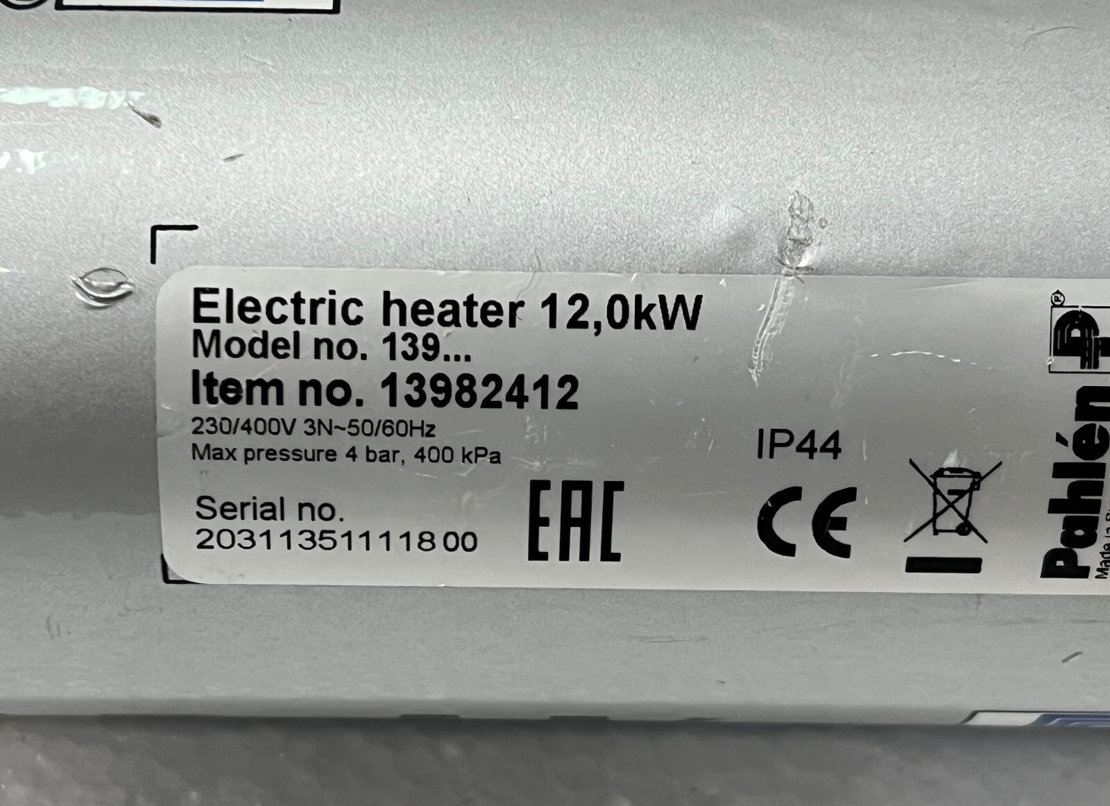 Pahlen Model 139 Swimming Pool Heater 12.0 kW Max Pressure 4 Bar, 400 kPa